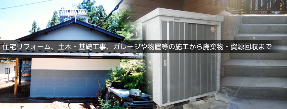また、住宅店舗等のリフォームをはじめ、一般土木、基礎工事、物置やガレージの施工といった工事までの、